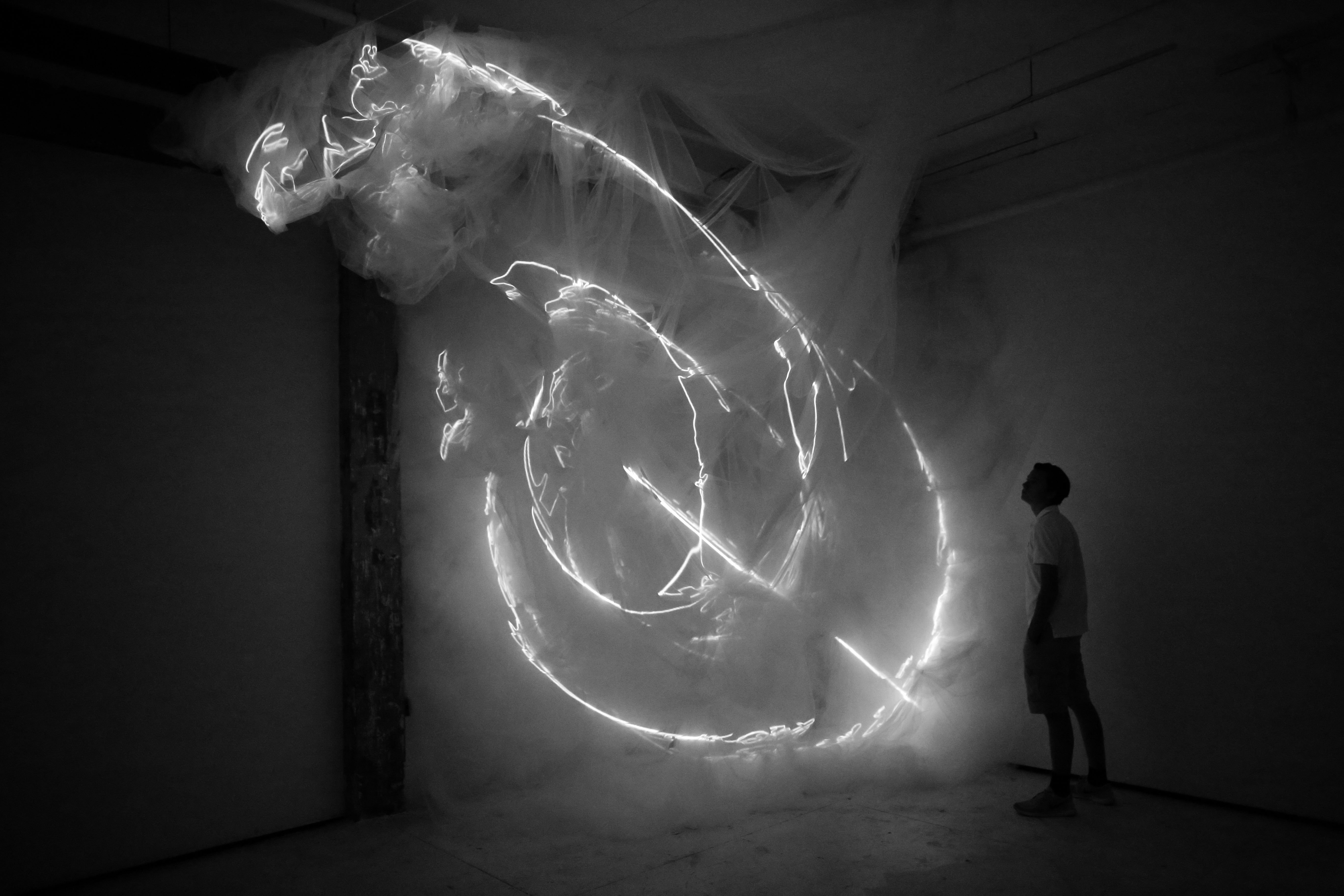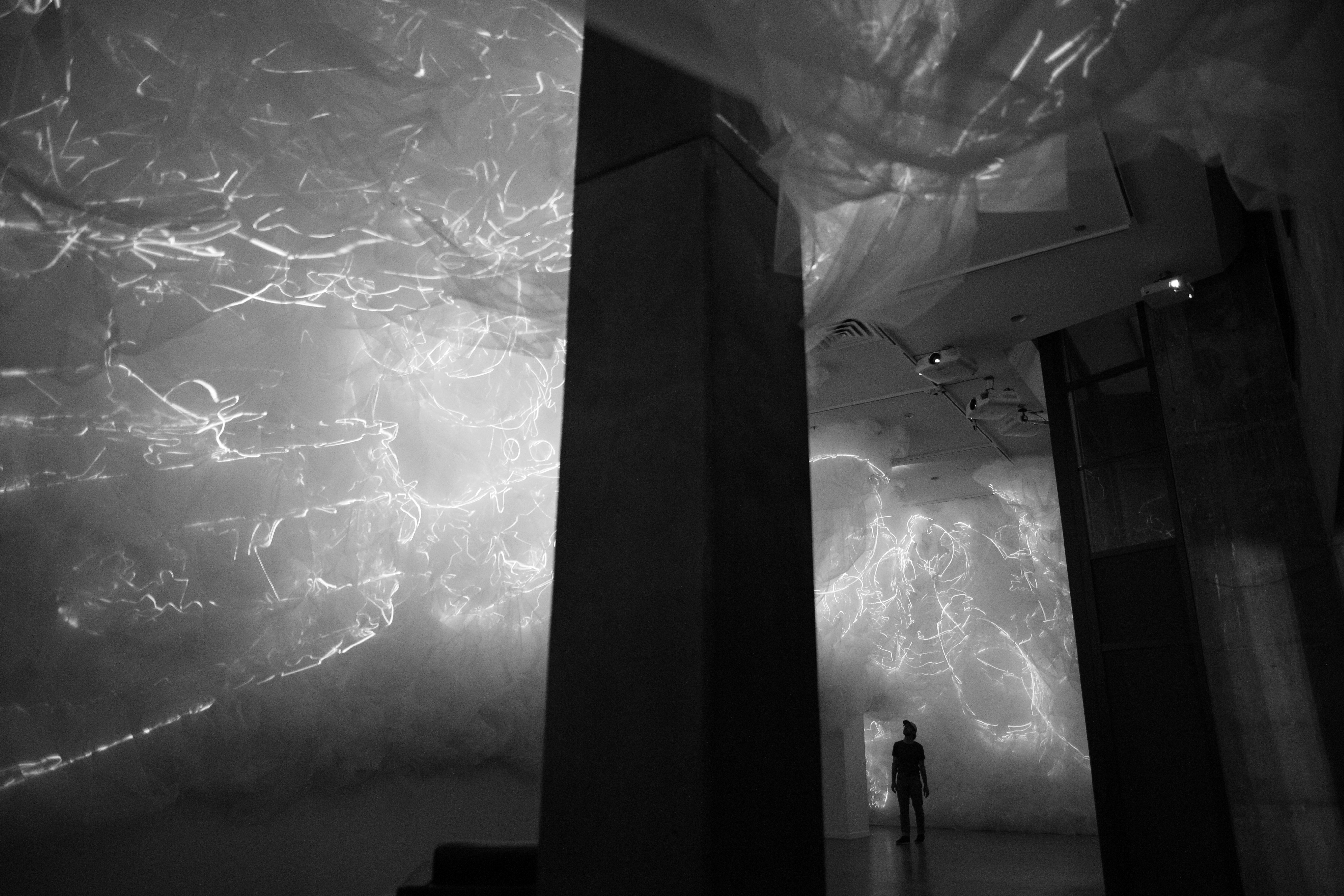 BREATH OF THE SEA opened August 29th in Halifax, Nova Scotia at Dalhousie Art Gallery in the show "Atmospheric Events: James Geurts, Christine Sciulli, Andreas Schmid", part of RESPONSIVE: International Light Art Project Halifax. Breath of the Sea is a 10 channel video, site specific, architectural intervention commissioned by Dalhousie Art Gallery and co-produced with the Anna Leonowens Gallery, NSCAD University, with generous support of the Canada Council for the Arts. The fabric and video work swarms through low ceiling spaces into the 63'x 22' x18' high brutalist gallery, and is also viewed from the mezzanine above via four large irregular hexagonal portals.